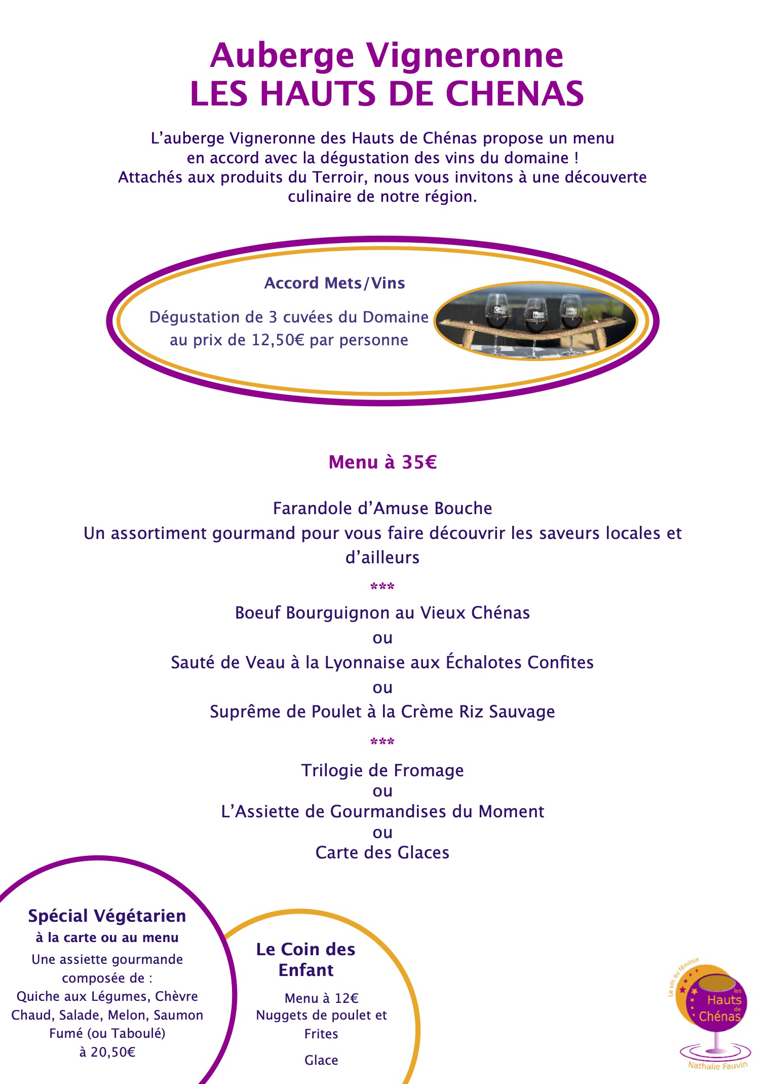 Notre métier est avant tout vigneron, l'auberge n'est pas un restaurant traditionnel. Nous proposons des plats de terroir simples et goûteux, qui s'accordent aux vins de notre domaine. Nous vous servirons l'été sur notre terrasse panoramique, et les mois plus frileux dans notre salle tout en profitant de la vue panoramique.